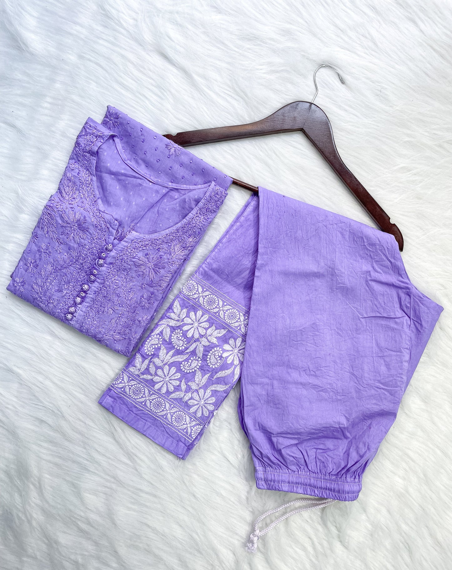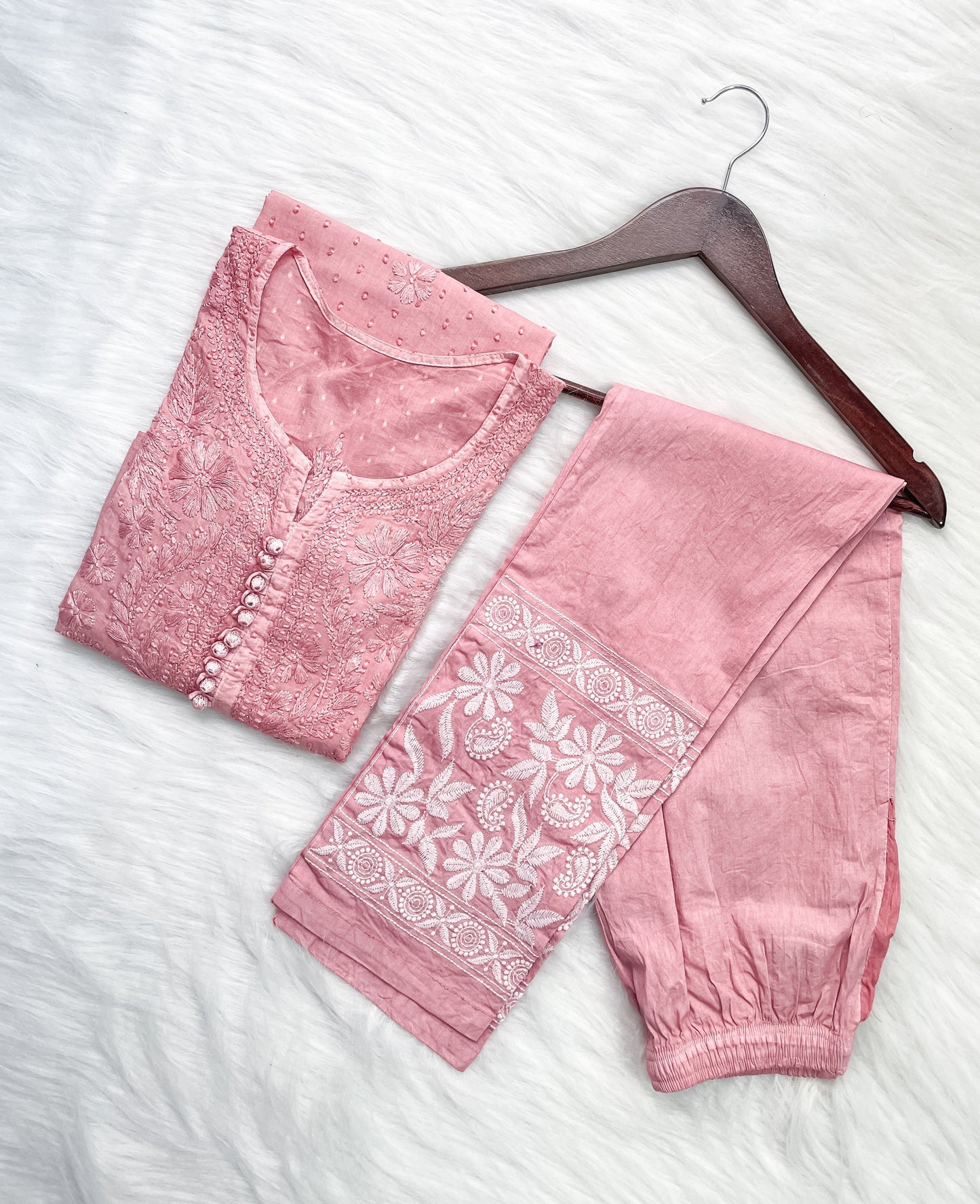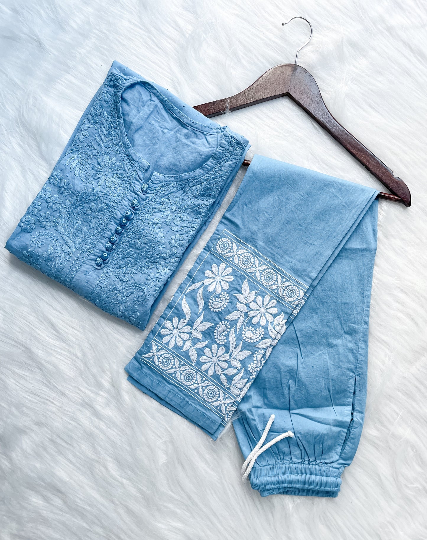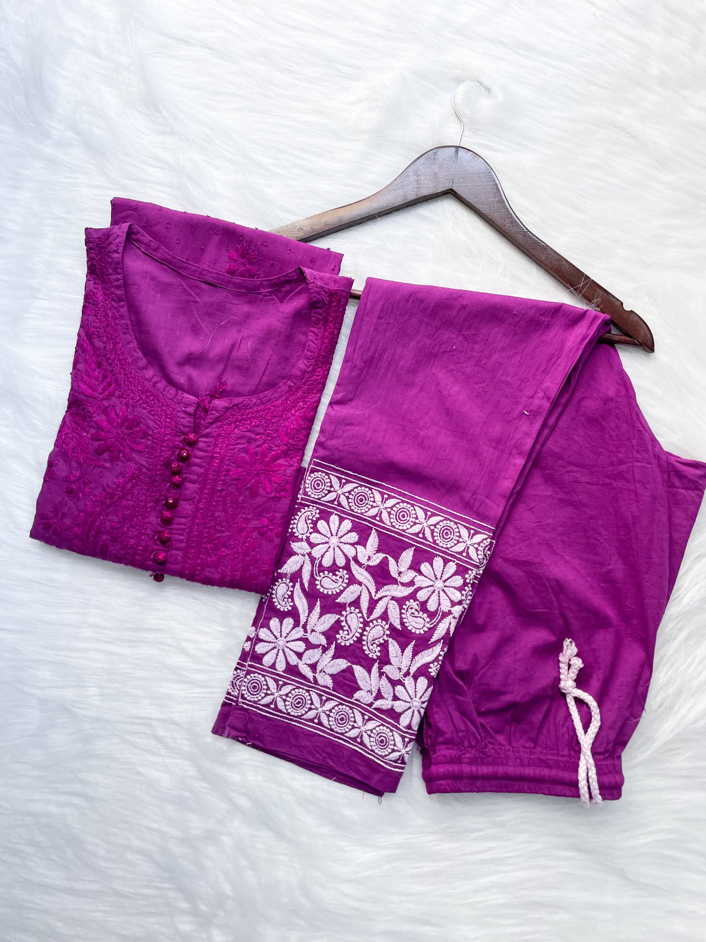 Dyed Cotton Chikankari Kurti & Lycra Pant Set, Pockets Both Side of the Pant