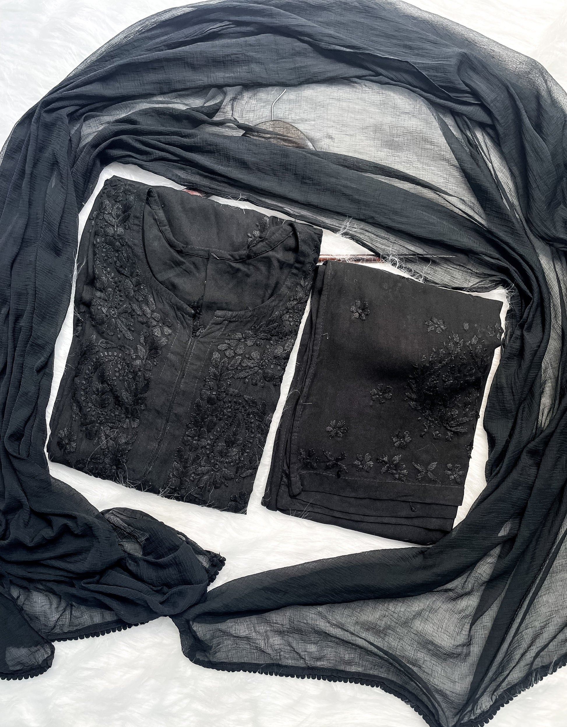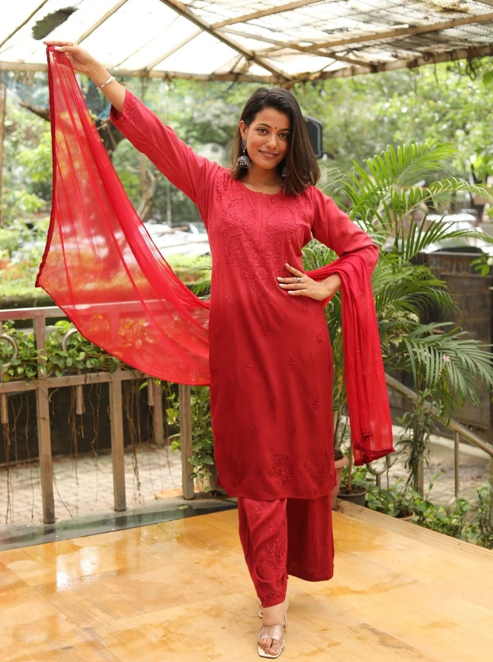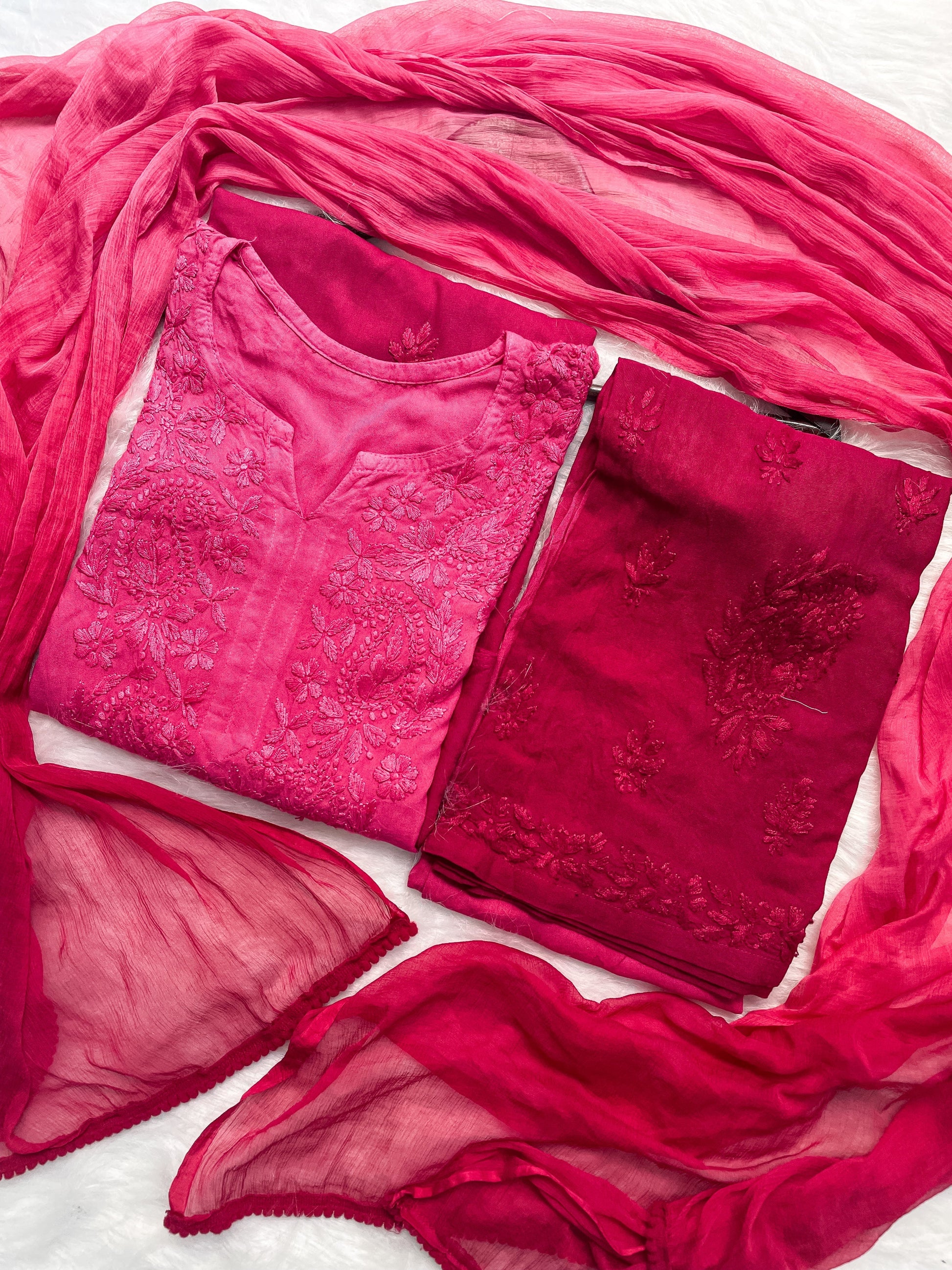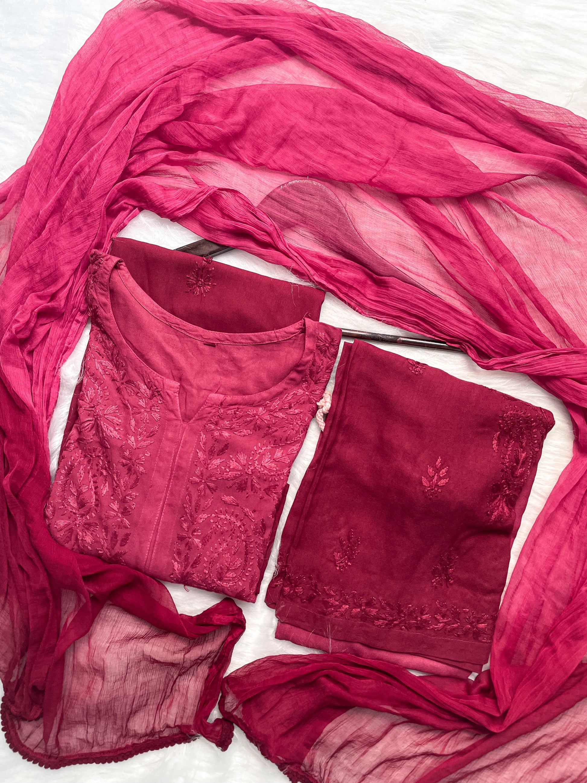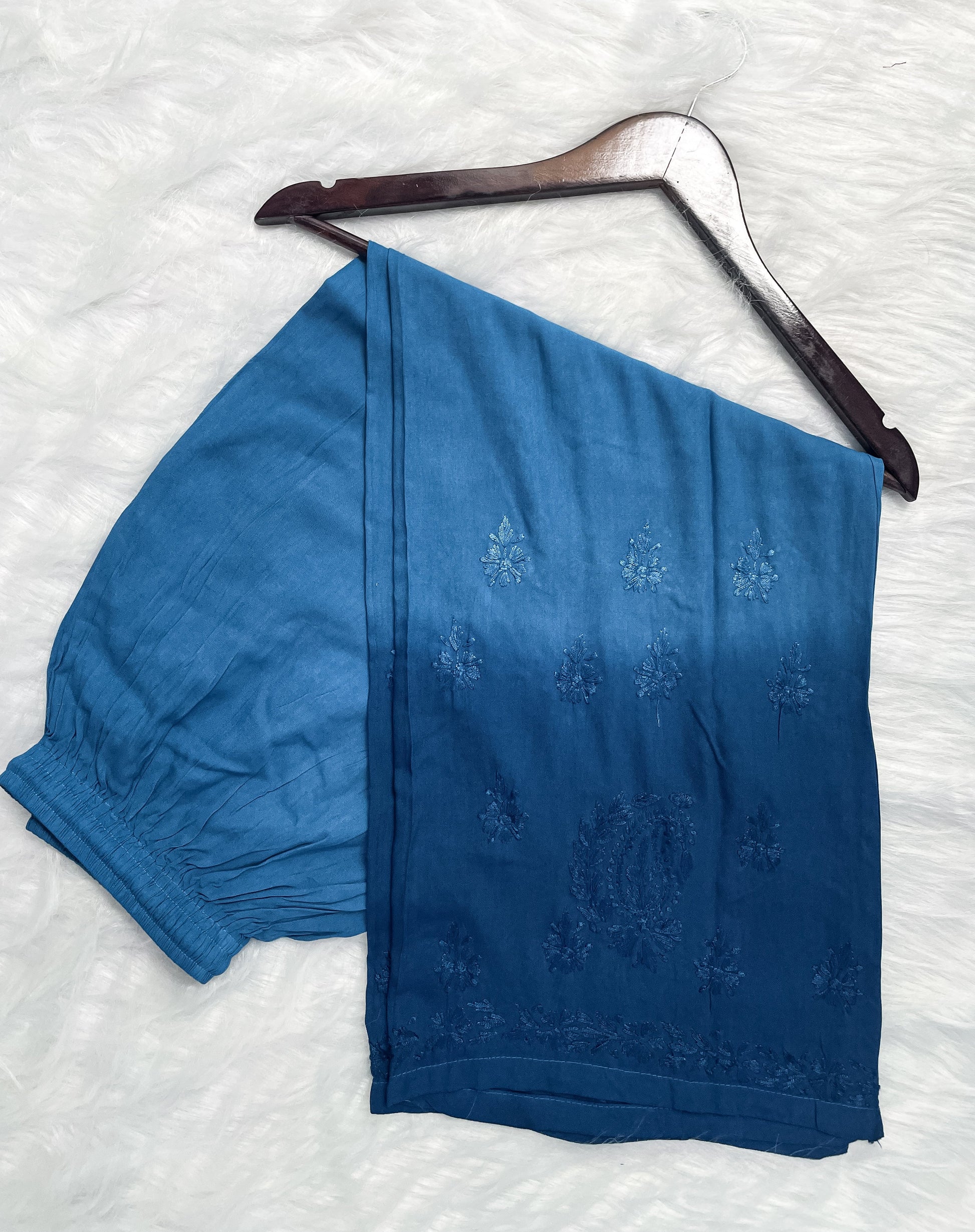 Ombre Dyed Shaded Rayon Lucknowi Chikankari Kurti, Palazzo and Dupatta Set.