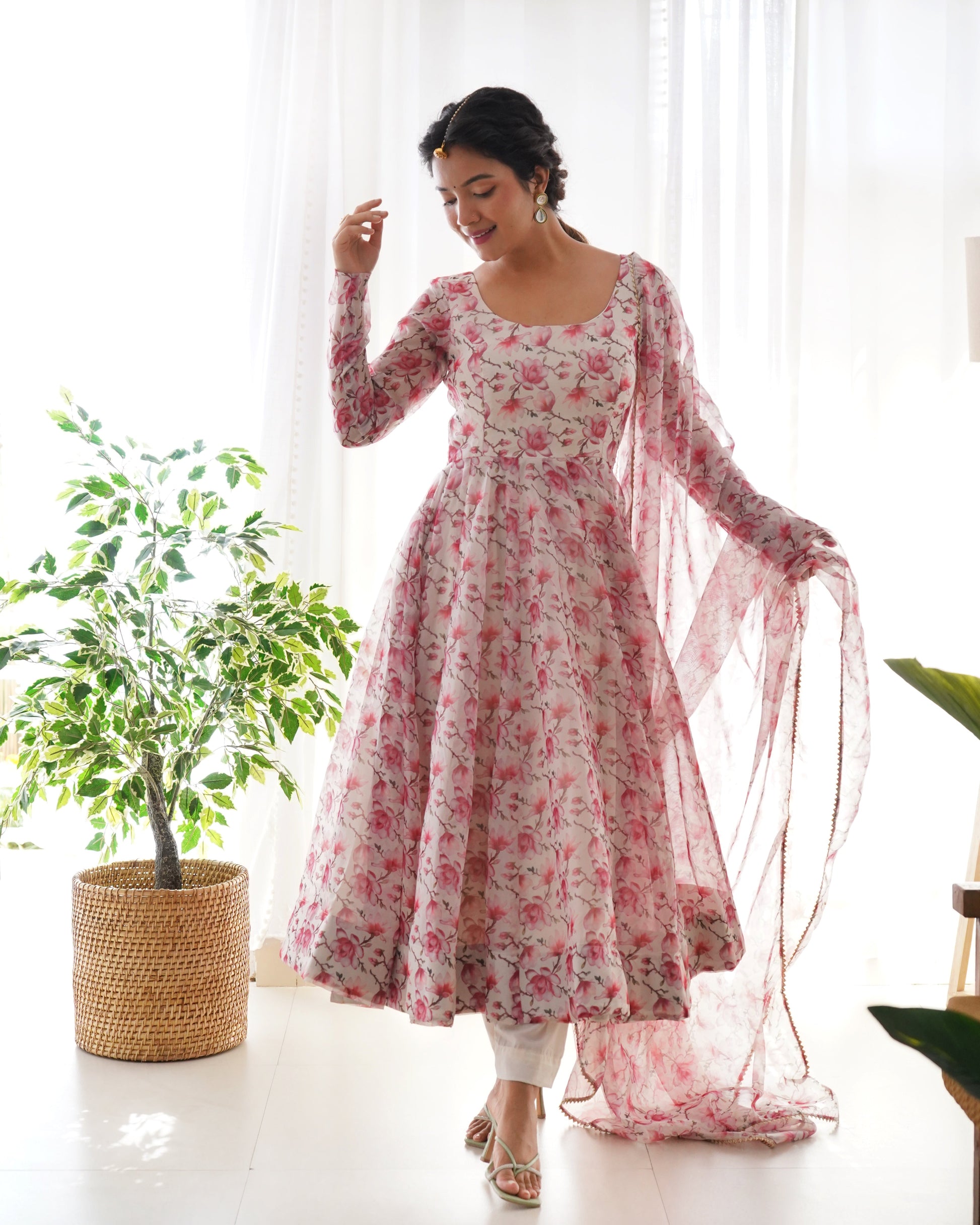 Pink Fulwari Organza Printed Anarkali Kurti With Pant & Dupatta Set