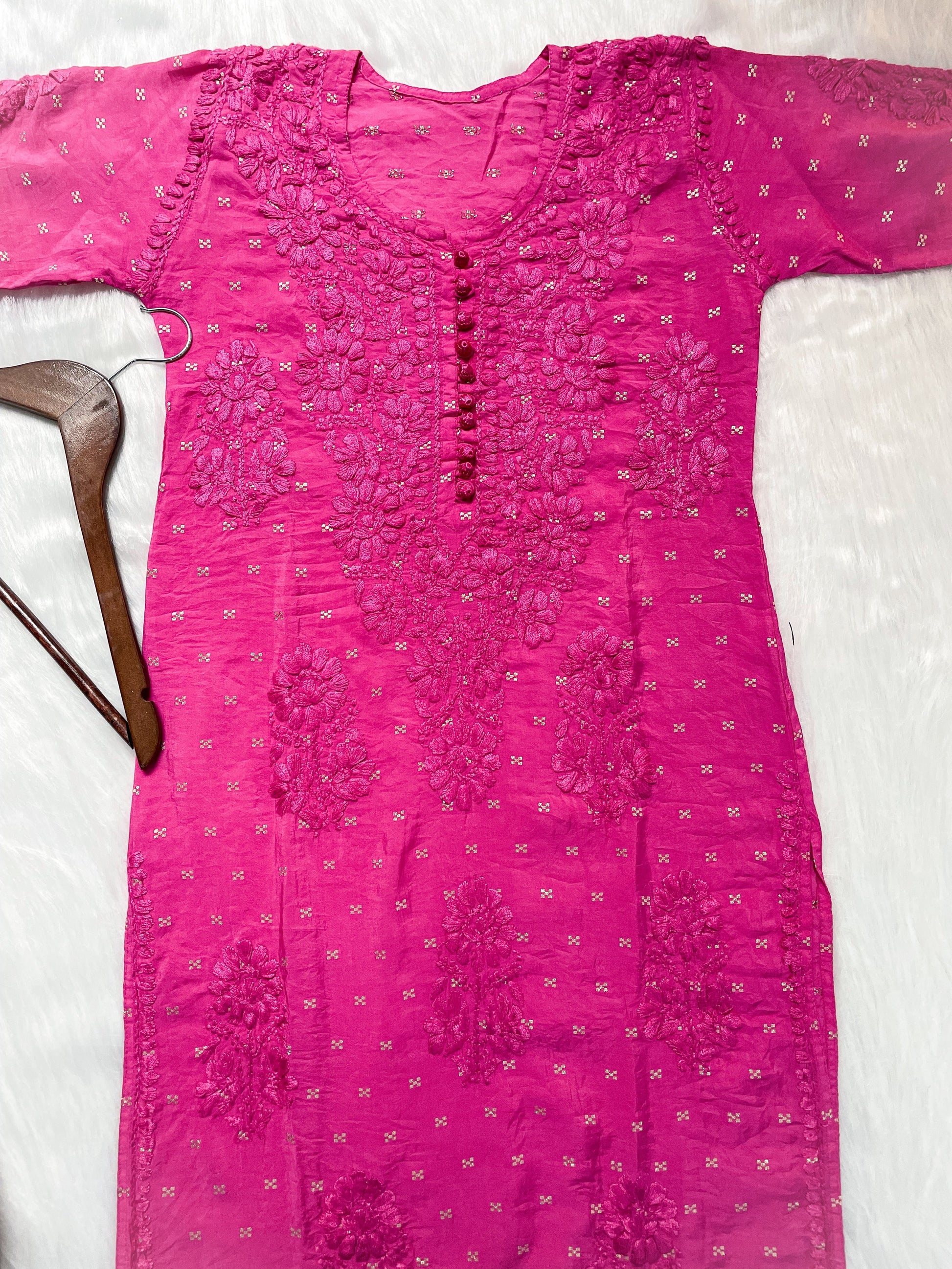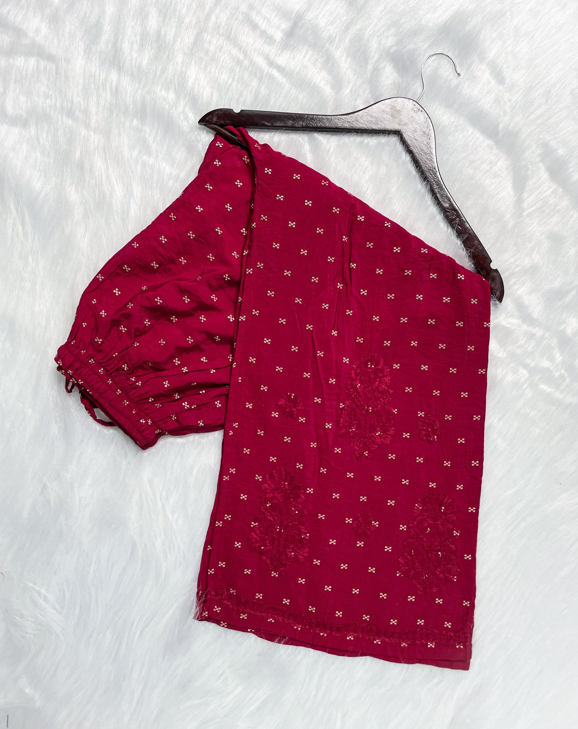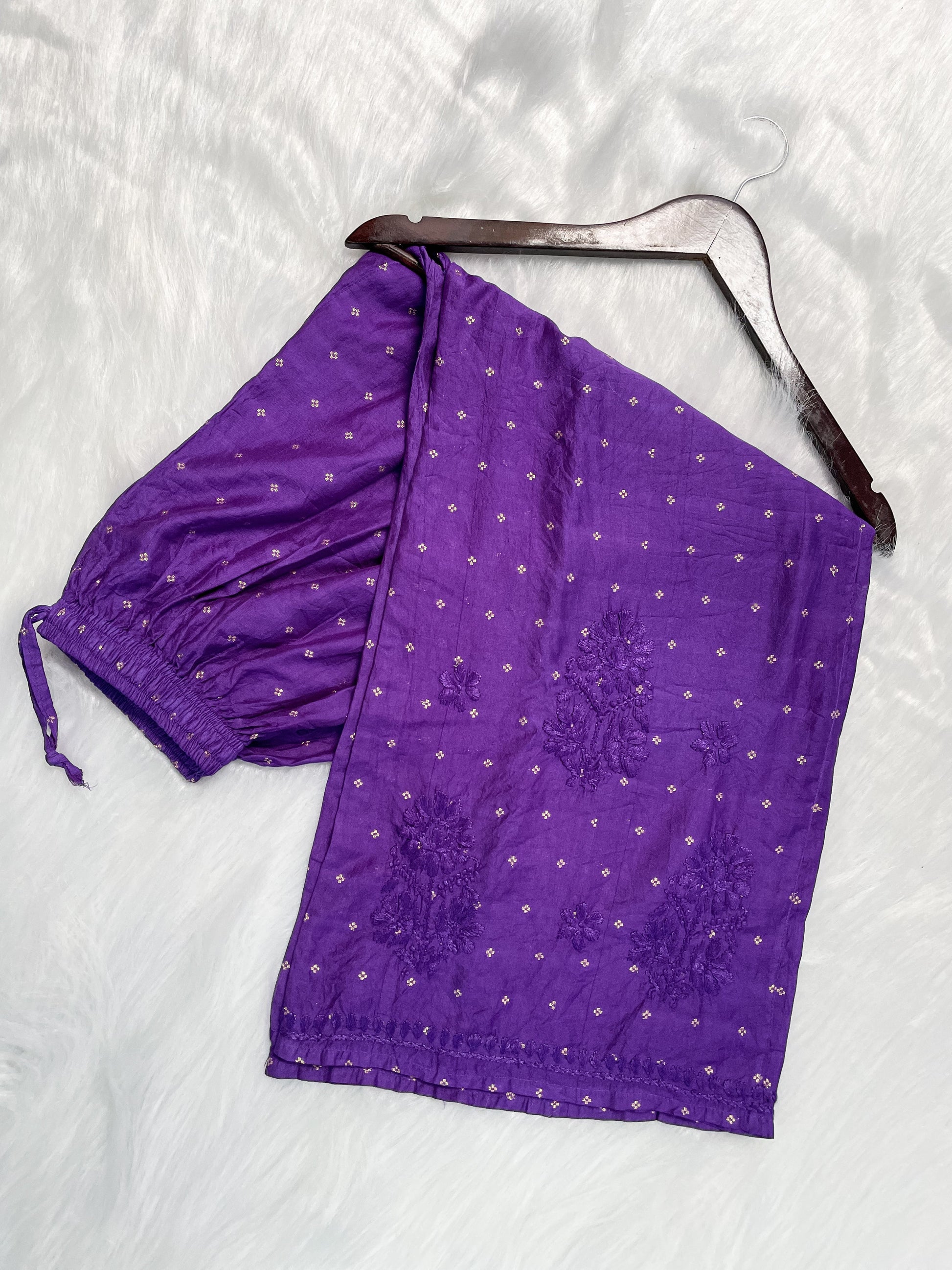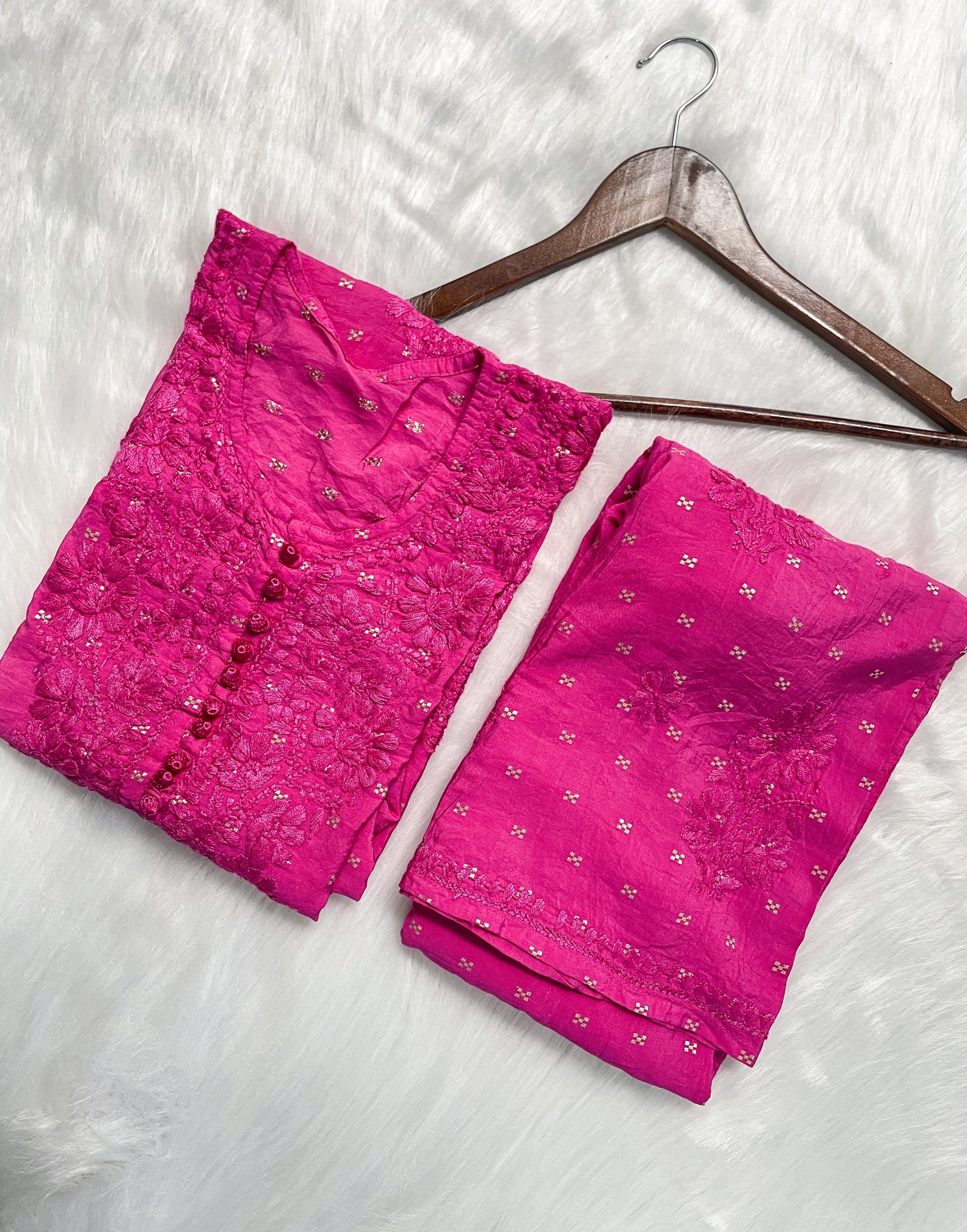 Premium Dyed Chanderi Silk Lucknowi Chikankari Kurti and Palazzo Set for Women