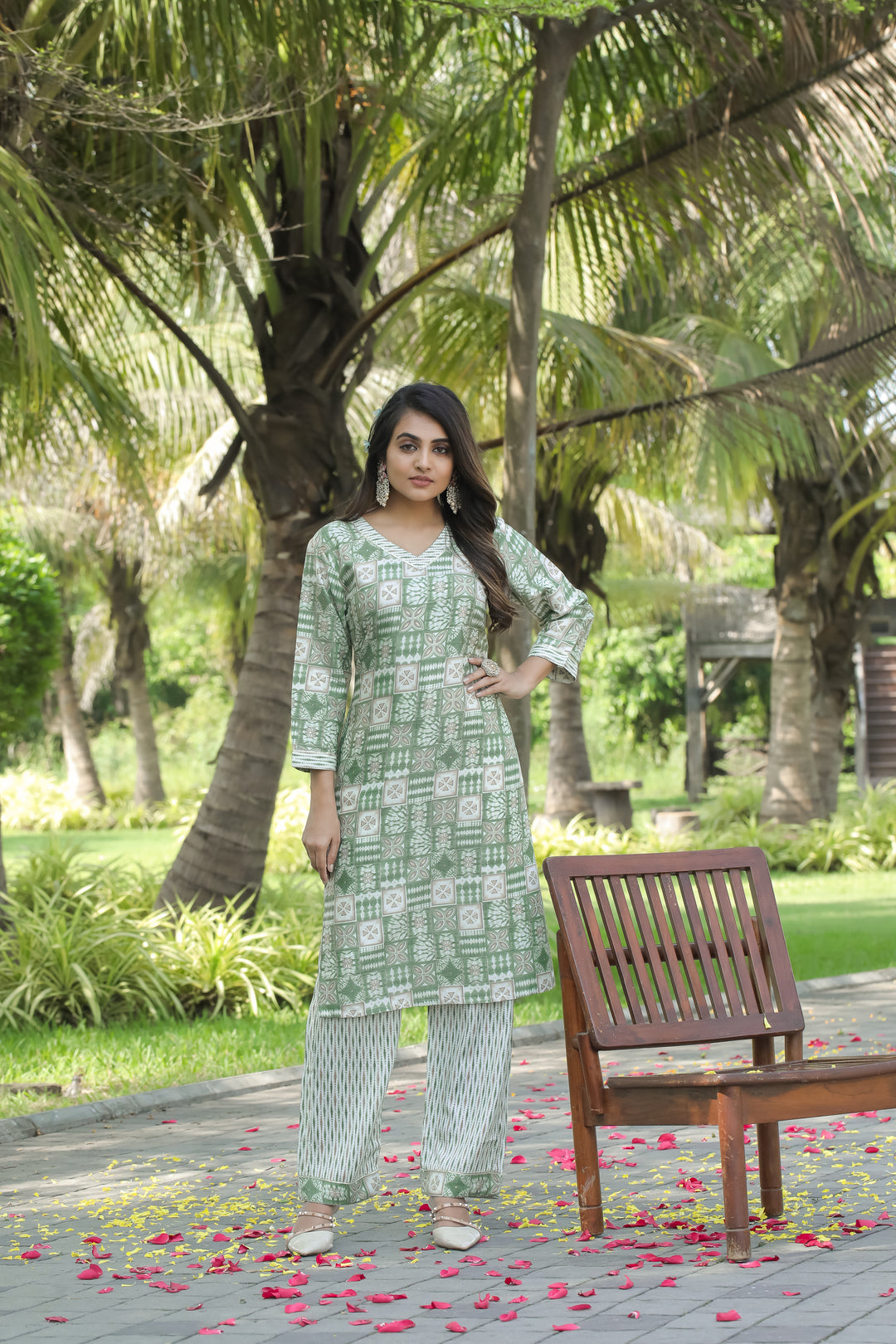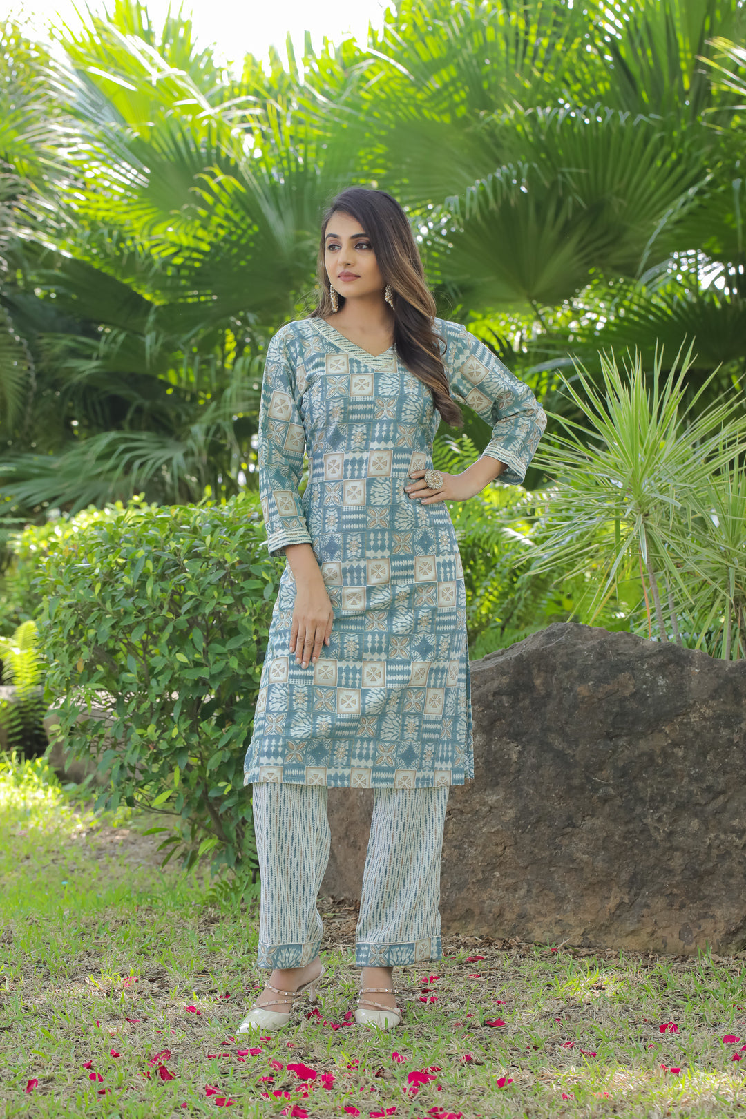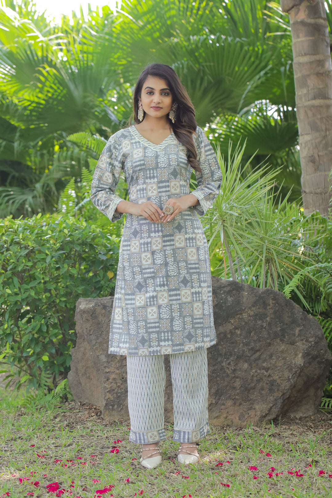 Stylish cord set for women featuring a floral printed kurta with button details and flared.perfect for a trendy ethnic look.