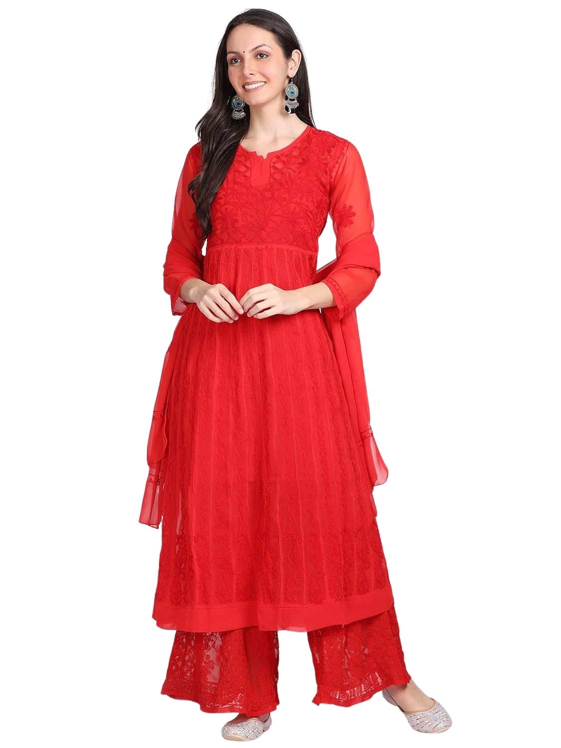 Faux Georgette Chikankari Flared Anarkali with Matching Dupatta & Cotton Inner
